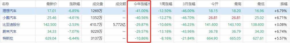 小鹏汽车和理想汽车年内下跌超40%,比亚迪和蔚来也下跌30%左右。如果从高位来算的话,回撤最大的小鹏和理想,都超过了60%,比亚迪也回撤了50%左右。