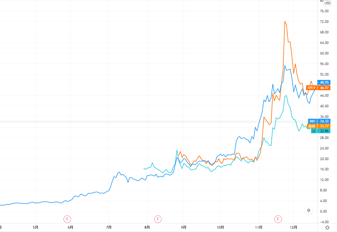 蔚来、小鹏、理想汽车2020年走势 来源:tradingview