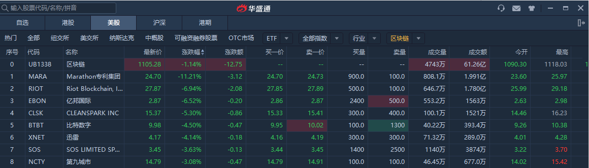 华盛资讯5月11日消息,美股区块链板块集体大跌,截止发稿,Marathon Patent(MARA.O)跌超11%,亿邦国际(EBON.O)和Riot Blockchain(RIOT.O)跌近7%、迅雷(XNET.O)微跌4.14%、第九城市(NCYT)跌3.08%。