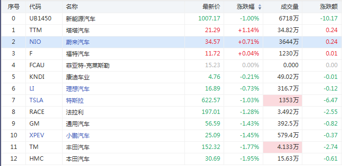新能源造车板块迅速收复失地,其中蔚来汽车(NIO)转涨,截至发稿涨近1%,盘前一度跌超10%;特斯拉(TSLA)、理想汽车(LI)跌幅收窄至约1%。