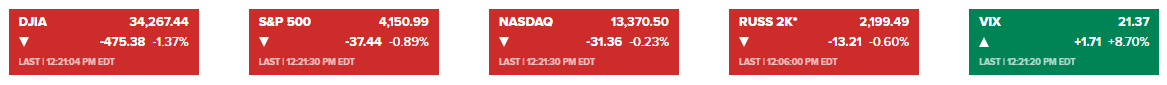 道琼斯指数盘中一度下跌667点,势将创下两个多月来最糟糕的一天。以科技股为主的纳斯达克综合指数一度大跌2.2%,现跌幅收窄至0.2%。标准普尔500指数下跌1%,11个板块均下跌。