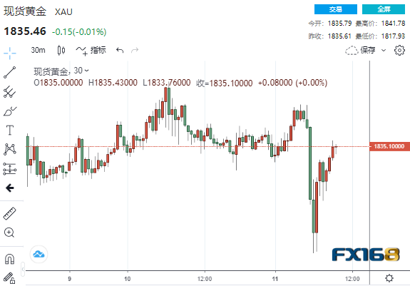 (现货黄金30分钟走势图,来源:FX168)
