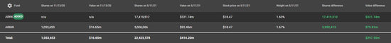 而同样是从去年11月3日起算至今,Cathie Wood所管理的ARKK和ARKW两只主动ETF基金均大举增持了Palantir,截至目前共持有超过2240万股,其中ARKK持有超过1740万股,权重为1.63%,而ARKW持有超过500万股,权重为1.67%。按收盘股价计算,市值超过4.53亿美元。