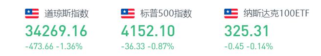 周二美股三大指数集体收跌,道指道琼斯指数收跌473.66点,跌幅1.36%;纳指跌0.09%报13389点;标普500指数跌0.87%报4152.1点。科技股涨跌不一,苹果跌0.74%,特斯拉跌近2%,亚马逊涨超1%。中概股跑赢美股大盘,雾芯科技涨9%,斗鱼涨6%,虎牙、拼多多、百度、哔哩哔哩涨超3%。