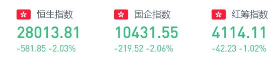 周二收盘,恒生指数跌581.85点或2.03%,报28013.81点。国企指数跌2.06%,报10431.55点,红筹指数跌1.02%,报4114.11点。