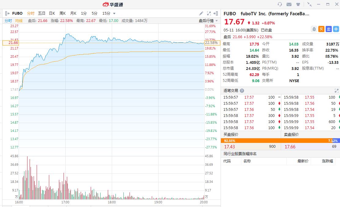 FuboTV(FUBO.US)2021年第一季度营收为1.197亿美元,同比增长135%;净亏损7020万美元,上年同期录得净亏损6660万美元;每股亏损0.59美元。在周二的盘后交易中,FuboTV飙涨22%。