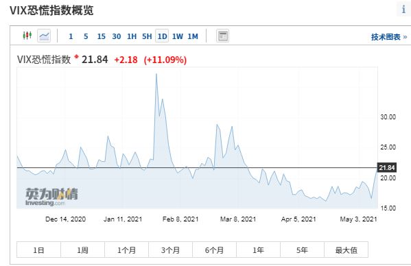在美股市场震荡的同时,衡量美股波动率的恐慌指数VIX大幅走高。截至收盘,VIX涨11.09%,报21.84。