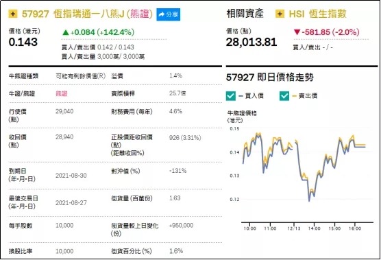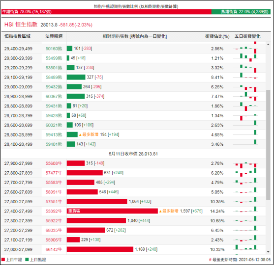 街货分布方面,至周二,恒指牛证街货在收回价27500点至28000点之间,累计相当约3041张期指合约;恒指熊证街货在收回价28400点至28900点之间,累计相当约582张期指合约。