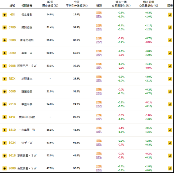 周二恒指相关权证的平均引伸波幅微幅上调,报约18.4%。个股方面,美团、纳斯达克、百度相关认购证的引申波幅有较明显上升,恒指、标普、小米相关认沽证的引申波幅有较明显下降。