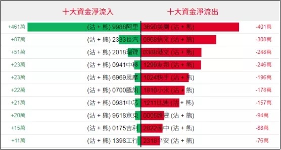淡仓(认沽证及熊证)方面,周二阿里相关淡仓单日录得461万港元资金净流入,美团相关淡仓单日录得401万港元资金净流出。