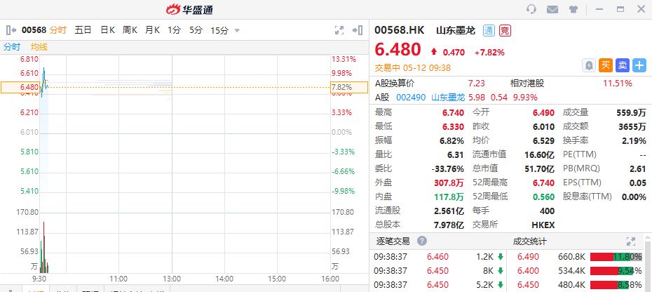 华盛资讯5月12日消息,山东墨龙发布公告,瑞森建材于2021年5月10日,通过深港通累计增持公司股份1001.92万股H股,增持股份数量占公司总股本的1.26%。受消息驱动,5月11日,山东墨龙逆市上涨超5%。今日早盘,山东墨龙继续拉升走高,一度刷新52周新高。截止发稿,山东墨龙涨超7%,现报每股6.48港元,总市值51.7亿港元。