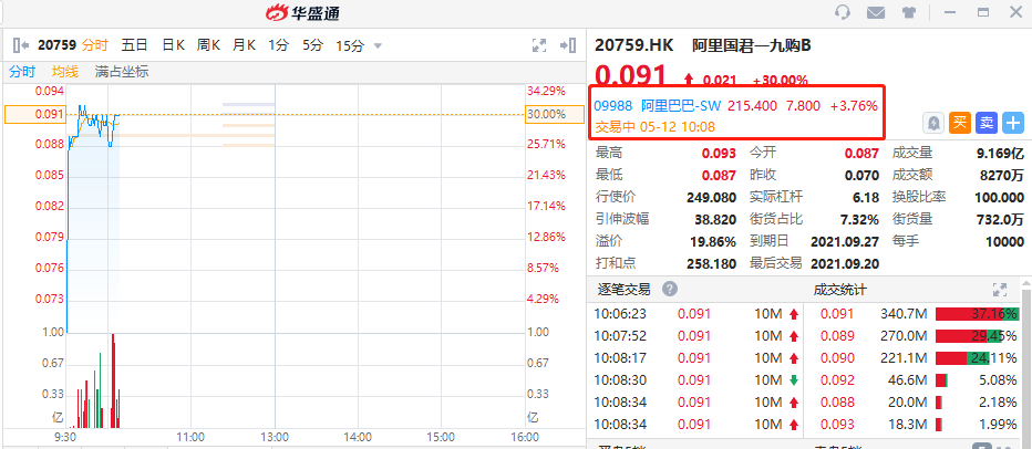 相关涡轮方面,阿里国君一九购B大涨30%,成交额8270万港元,其行使价为249.08港元,到期日为2021年9月27日,溢价率达19.86%。