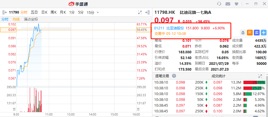 相关涡轮方面,比迪花旗一七购A大涨56.45%,成交额422.3万港元,其行使价为163.88港元,到期日为2021年7月29日,溢价率达14.35%。
