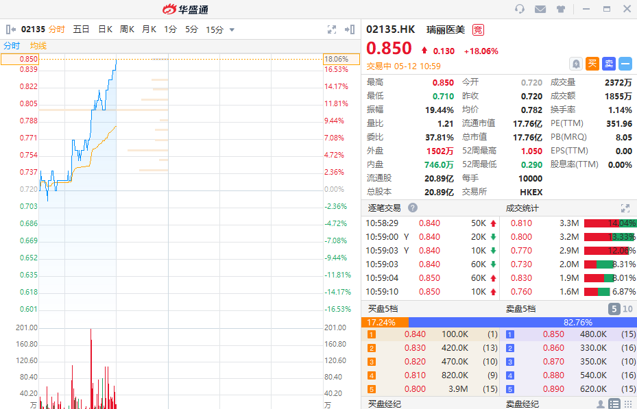 华盛资讯5月12日消息,瑞丽医美盘中走高,股价大升逾18%,现报0.85港元每股,成交额为1855万港元,换手率达1.14%。此前连续三日下跌。
