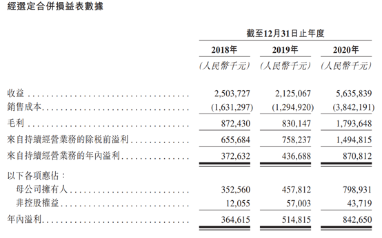 于2018年-2020年,公司的收入分别为25.04亿元、21.25亿元及56.36亿元,复合年增长率达50.0%;净利润也由2018年的3.65亿元按复合年增长率52.0%增长至2020年的人民币8.43亿元。