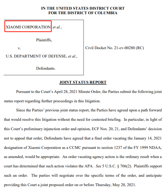 根据5月12日外媒消息指出,小米集团和美国国防部再次就军事清单诉讼发布了联合状态报告。这份报告显示双方已经同意和平解决诉讼案。