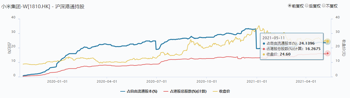 根据wind的数据显示,截至2021年5月11日南下资金对于小米集团自有流通股本持有占比为24%,从2021年初至今呈现稳步提升的趋势。