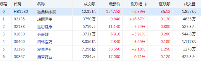 医美概念股近日高位调整,今日再获资金追捧,截至发稿,瑞丽医美(02135)涨16.67%,报0.84港元;医思健康(02138)涨7.74%,报11.14元。必瘦站涨3.91%。