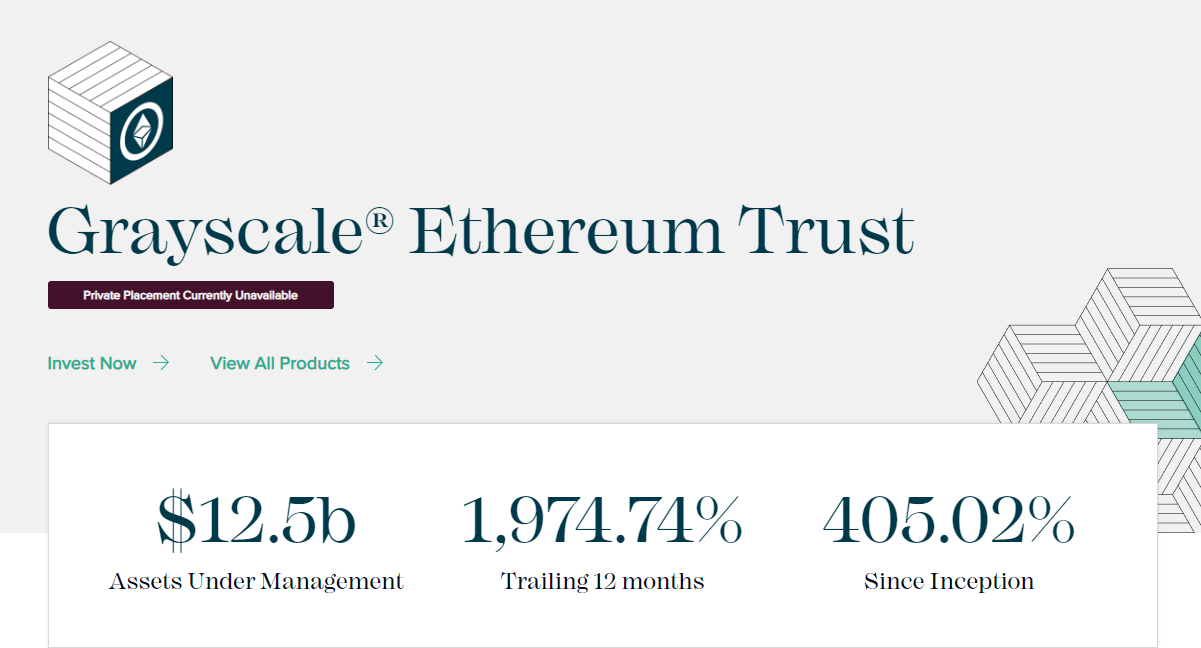 在2020年11月20日,全球最大加密资产管理公司灰度(Grayscale)宣布ETHE成为美国第一个公开报价的以太坊投资产品,以及第二个获得SEC报告公司地位的数字货币投资工具。ETHE在美国场外交易市场OTCQX挂牌交易,代码为ETHE。