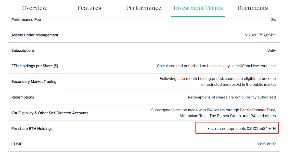 根据ETHE公开资料显示,我们可以发现每股的ETHE代表的是实际持有以太坊的份额,因此可以通过这个份额比例算出ETHE对于以太坊的溢价率。