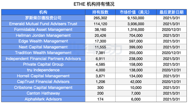 罗斯柴尔德投资公司是一家创立于 1908 年,目前持有 12 亿美元二级市场头寸提供全面服务的经纪公司。目前,Rothschild Investment 于 2021 年第一季度购入 26.53 万股 ETHE,目前价值约 915 万美元。