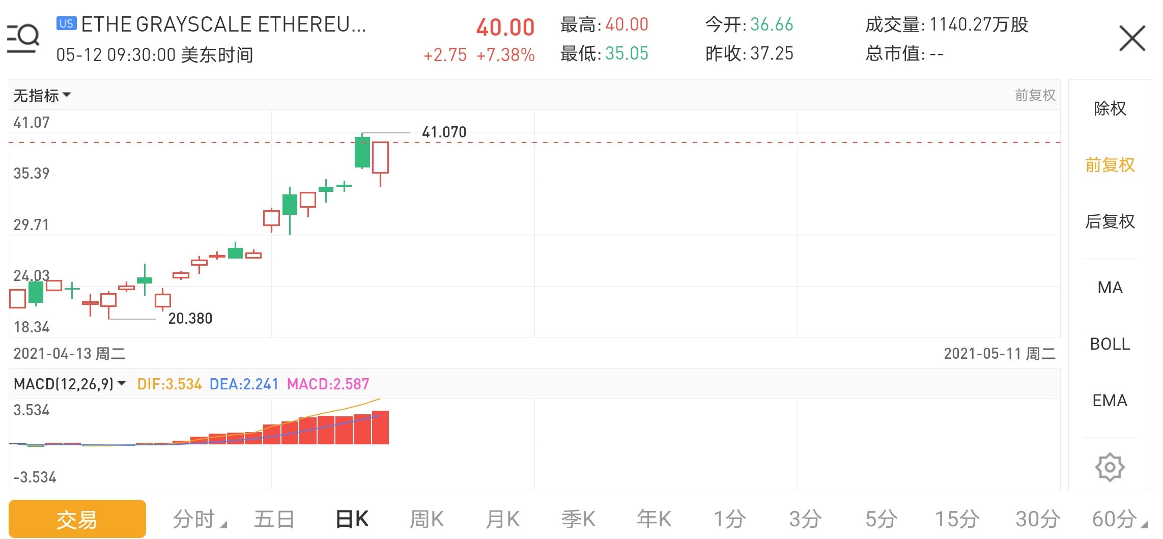 5月12日,加密货币以太坊一度涨破4300美元/枚,续刷历史新高。另外,以太坊信托基金的ETHE近期走势也十分惊人,从4月20号20.38美元低点到5月10号41.07美元高点,该以太坊信托基金ETHE涨幅超100%。