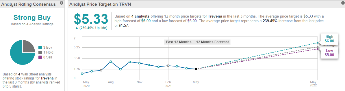 华尔街其他分析师也对Trevena持乐观态度,目前有三位建议买入、一位建议卖出,该股共识评级为“强劲买入”,平均目标价为5.33美元,意味着未来12个月其股价较当前水平存在239.4%的上行空间。