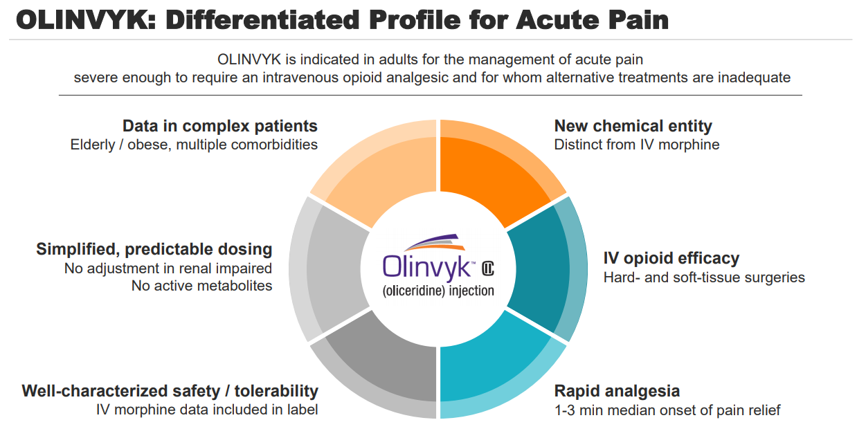 据公司介绍,Olinvyk的活性药物成分oliceridine是首个G蛋白选择性激动剂,与静脉注射吗啡相比,镇痛效果更好。另外,Olinvyk起效迅速且疗效持久,大多数患者在给药后2-5分钟就感到疼痛缓解、疗效持续约3小时。