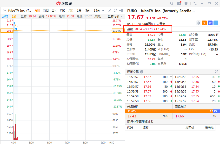 个股方面,fuboTV(FUBO)盘前一度涨超22%,截至发稿涨幅收窄至18%,公司第一季度营收好于市场预期,ARPU快速增长。