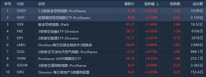 从ETF涨幅榜来看,涨幅居前的主要是恐慌指数的ETF相关。其中,1.5倍做多恐慌指数的UVXY涨近11%,成交额10.09亿美元;短期期货恐慌指数的VIXY涨近8%,成交额2.13亿美元;做多恐慌指数的VXX涨超7%,成交额16.52亿美元。