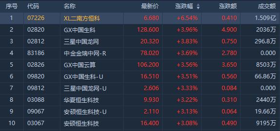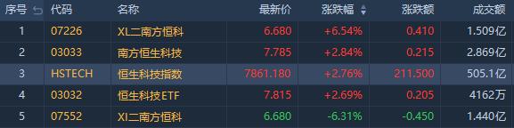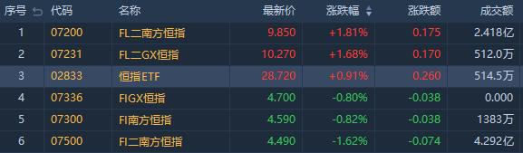 看多恒指相关ETF走强,南方两倍做多恒科(07226.HK)涨6.54%,成交额1.51亿港元;