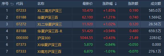 沪深300指数收涨0.43%。其中,华夏沪深三百ETF(03188.HK)涨1.21%,成交额约1.57亿港元;华夏沪深三百-R(83188.HK)涨0.94%,成交额达659.5万港元。