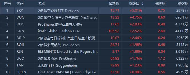 受消息影响,2倍做空能源ETF的ERY大涨5%,成交额2978万美元;2倍做空石油与天然气指数的DUG涨4.75%。