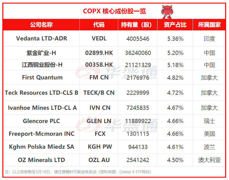 与CPER不同,COPX追踪的是一批参与铜矿开采的公司表现。前十大重仓股如下: