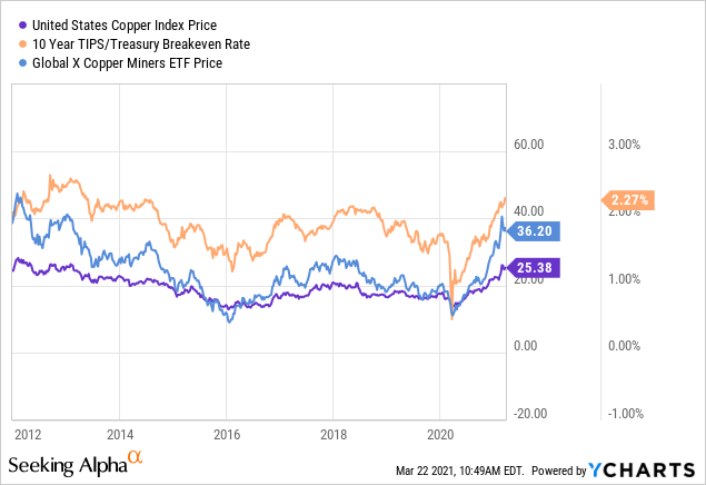 这两只ETF各自追踪铜矿行业不同的标的,但历史数据显示,均与美国十年期国债收益率有联系(见下图)。而铜的确是重要的通胀指标之一,几乎所有的电子产品都需要用到铜。在美国通胀预期大幅上升的背景之下,这两只ETF的表现或许可以期待一下。
