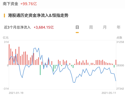 南下资金今日净流入港股高达99.76亿港元,而周二为净流入超64亿港元。