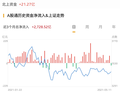 北上资金今日净流入21.27亿元,周二为净流出超23亿元。