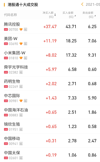 个股方面,今日南下资金净买入腾讯控股37.47亿港元,为今日买入之最。此外,南下资金净买入美团11.19亿港元,净买入小米集团8.02亿港元。