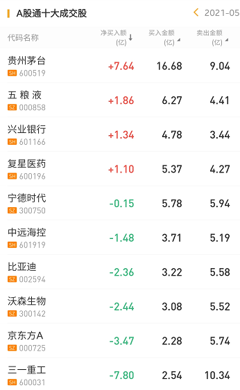 北上资金今日净买入贵州茅台7.64亿元,为今日买入之最。此外,北上资金今日净买入五粮液1.86亿元,净买入兴业银行1.34亿元。