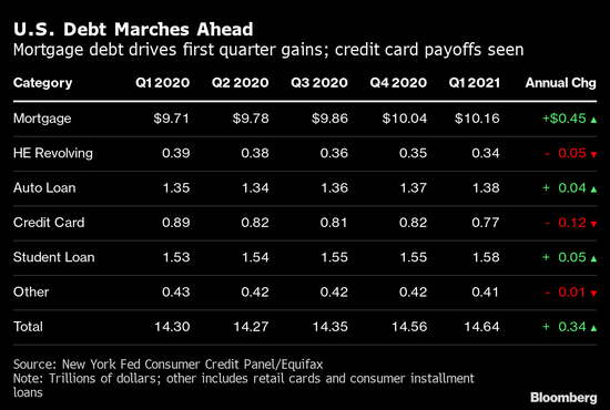 在房屋和汽车贷款的推动下,美国家庭的债务余额在3月份达到创纪录的14.6万亿美元。但在这种增长之下,有一个现象令纽约联储研究人员感到不解:在零售销售猛增和旅行恢复的这个季度,信用卡债务余额却出现“令人困惑的”下降。