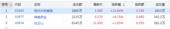 港A两市中医药概念股今日逆市走高,截至发稿,现代中药集团(01643)涨22.84%,报1.06港元;神威药业(02877)涨8.15%,报6.37港元;白云山(00874)涨1.65%,报21.6港元。
