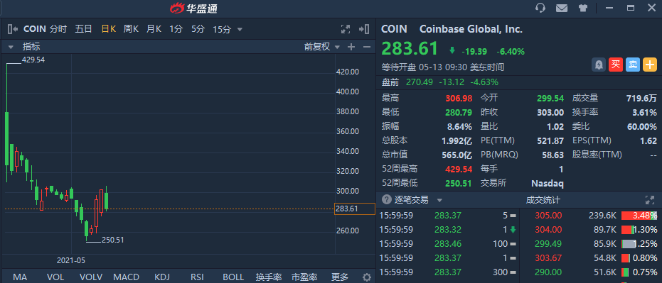 值得注意的是,Coinbase当前的股价较4月14日上市时的盘中峰值429.54美元跌去了30%以上,比上市首日的收盘价下跌了约16%,目前其市值约为564亿美元。截至发稿,该股盘前跌4.63%,报价270.49美元。