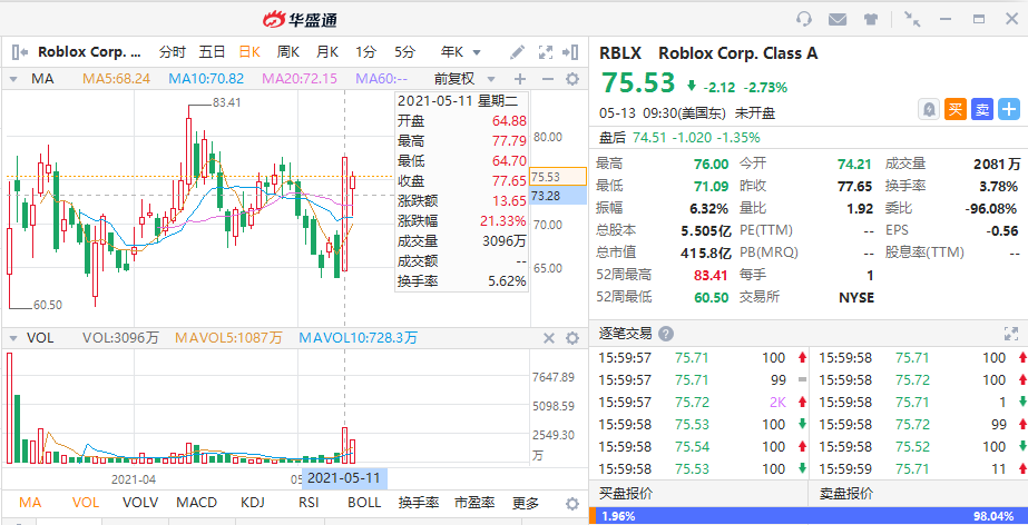 尽管随着美股市场的调整,Roblox的股价也一度从历史最高83.41美元跌至64美元水平。