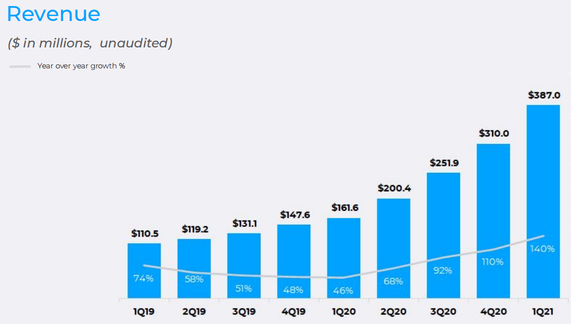 Roblox在2021年一季度实现了营收同比增长高达140%,金额达到3.87亿美元。