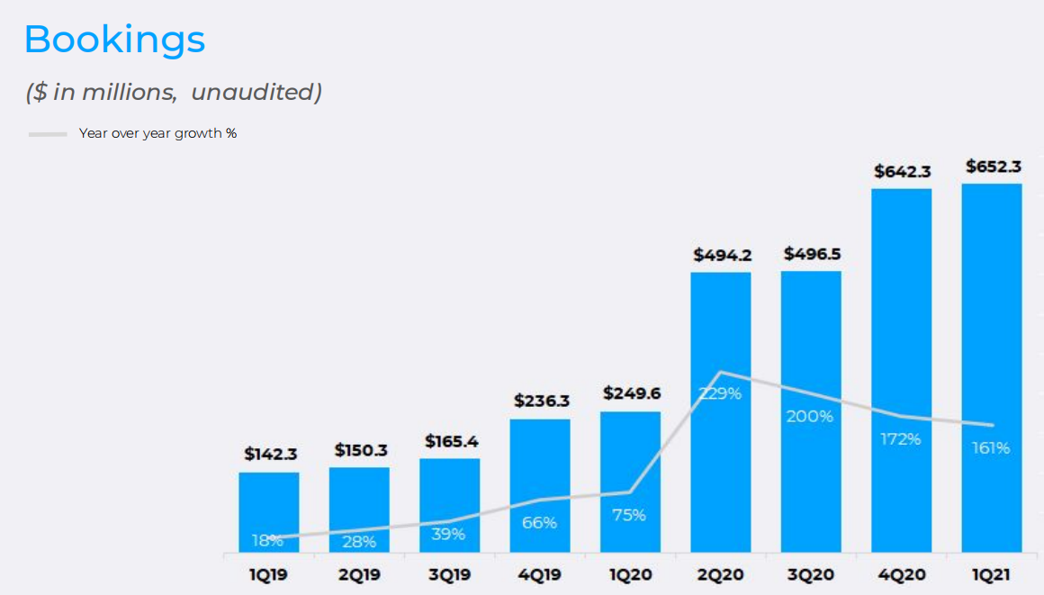 (Bookings)预定量也就是Roblox出售Robux获得的收入,该指标在一季度同比增长161%,达到了6.5亿美元,大幅超出此前市场的5.5-5.75亿美元的预期。