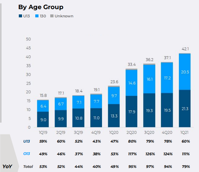 但是随着更多高龄高消费力用户占比提升,Roblox的变现能力也会大幅改善,比如2021年一季度Roblox平台上13岁以上的用户量占比约为47%,较上一年40%的占比上升了7%。