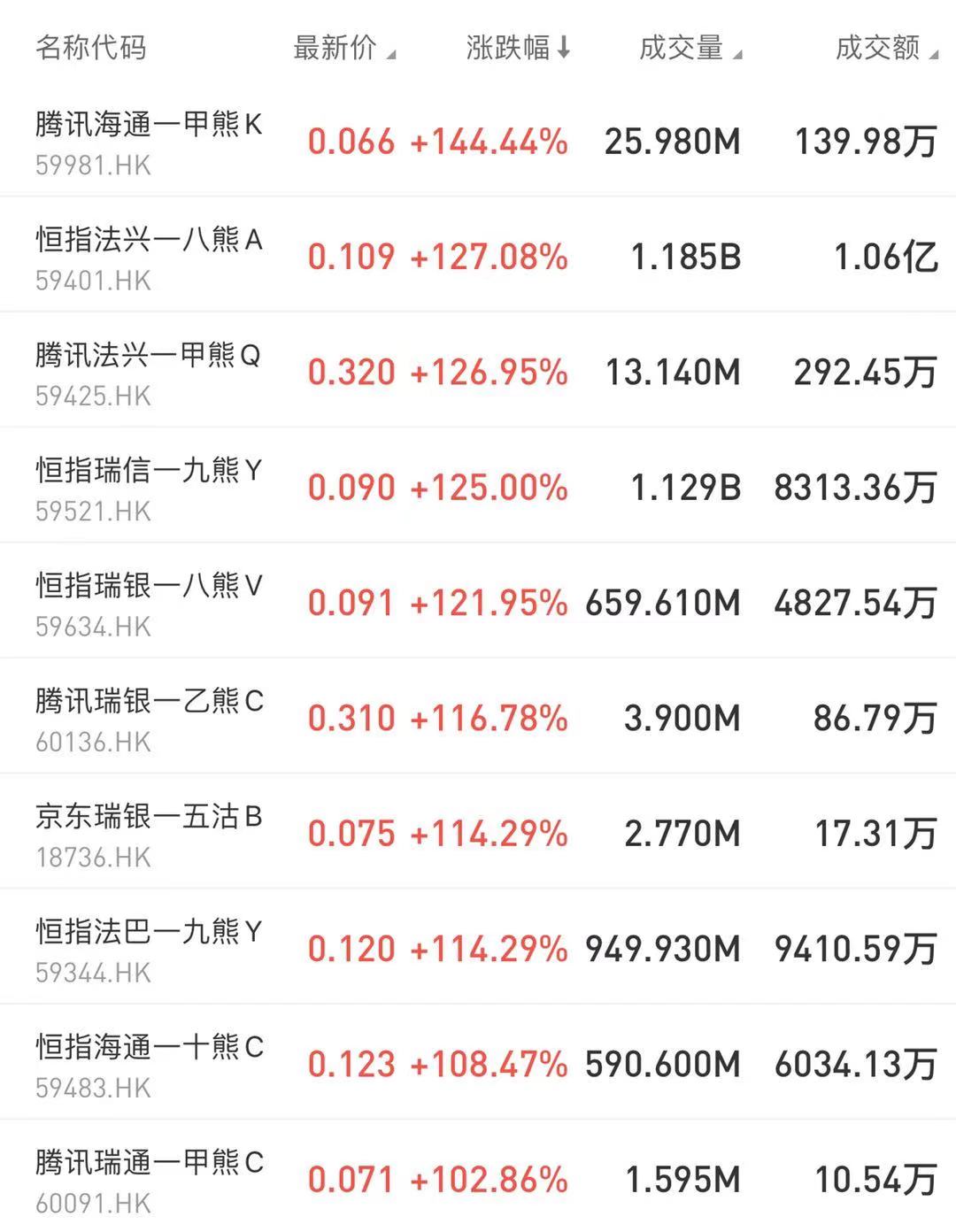 腾讯海通—甲熊K涨144.44%占据涨幅榜第一。其次是恒指法兴—八熊A涨127.08%、腾讯法兴—甲熊Q涨126.95%。