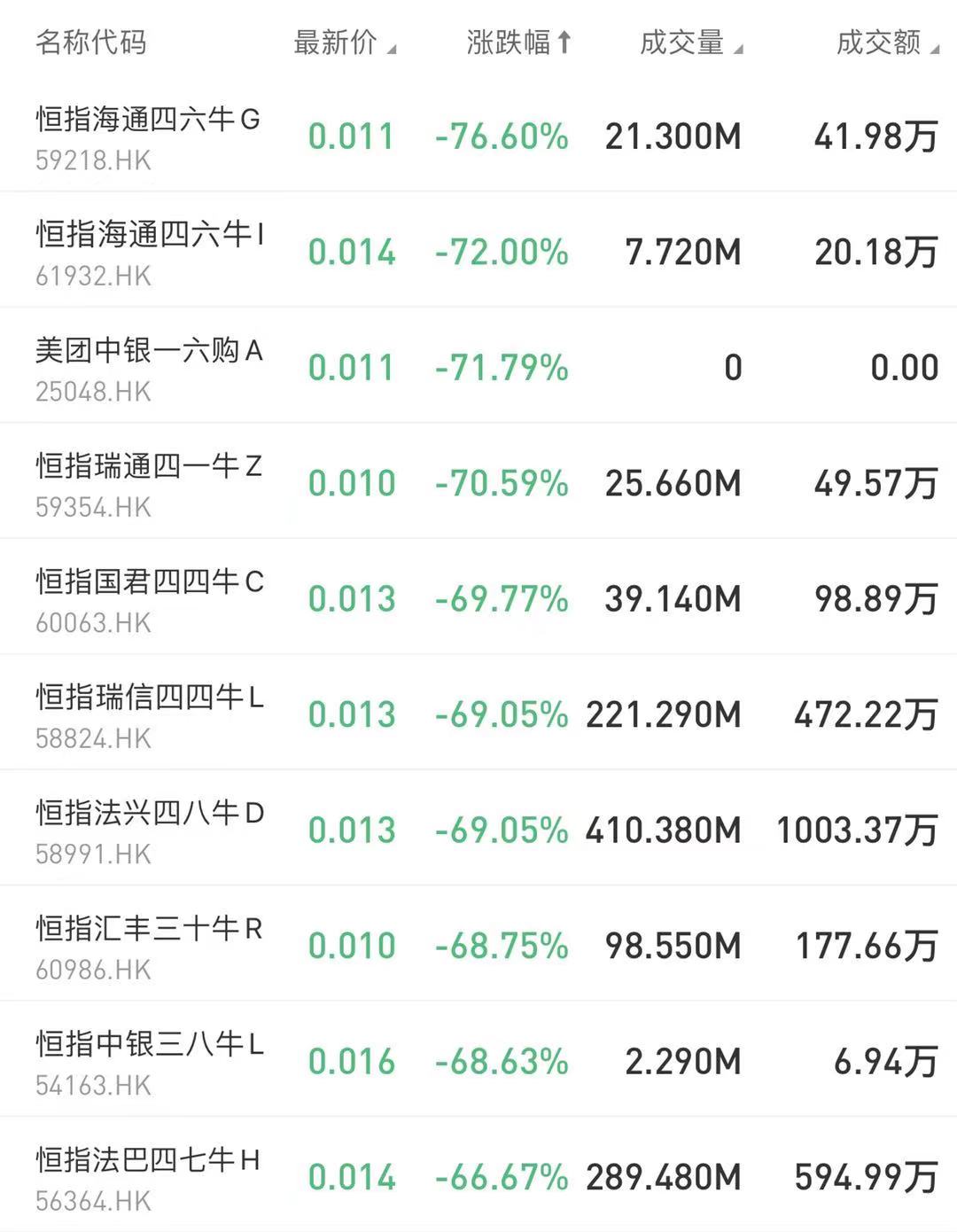 在今日跌幅榜中,恒指海通四六牛G跌76.6%;恒指海通四六牛I跌72%。