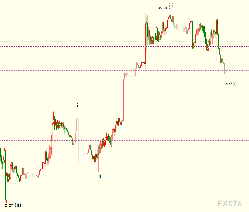 下方终极支撑看向1799美元,不仅是iii浪的61.8%斐波那契回档位,也是i浪的终点。iii浪和iv都是自1756美元开启的上行(iii)浪的子浪,(iii)浪是5浪的子浪。