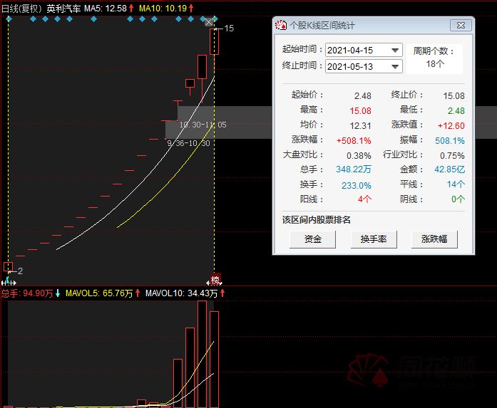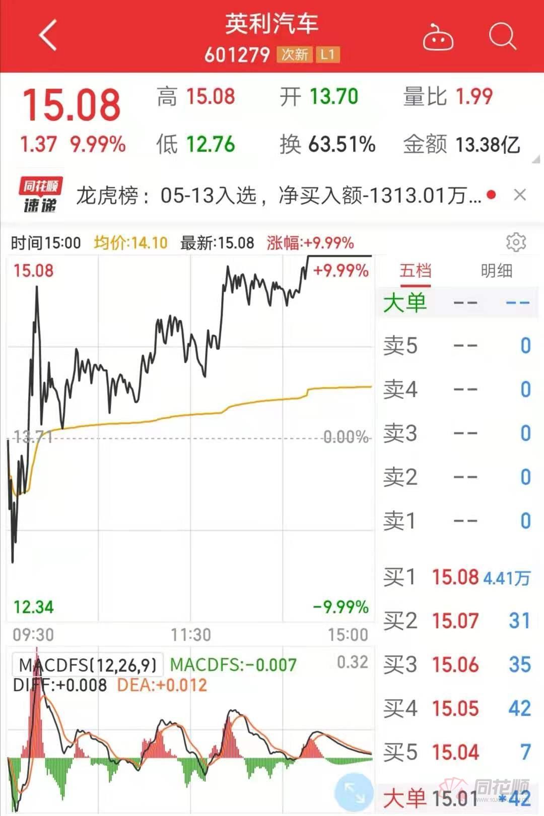 5月13日,人气次新股英利汽车又双叒叕涨停了,截至收盘,股价报15.08元,全天成交额超13亿元。